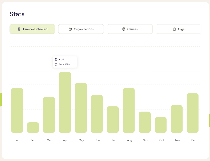 Go out there and make an impact. You’ll get a full report of your volunteer activities to look back at your achievements and share your wins with others.